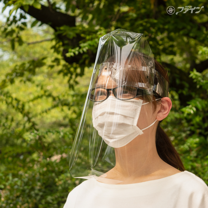 組み立て式で、A3のシート状の本体と輪ゴムが2つあれば出来上がる、場所を取らないフェイスシールドです。